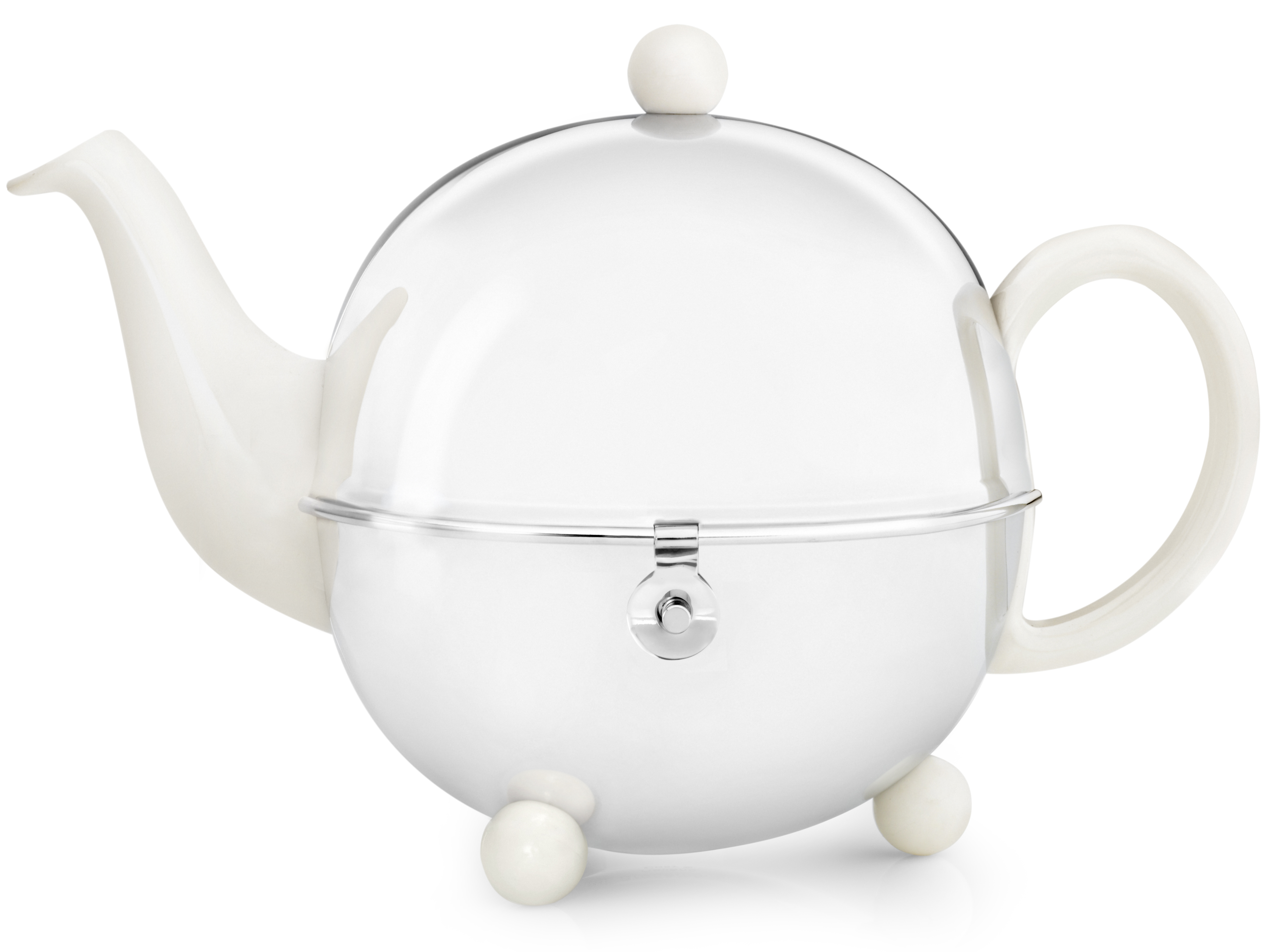Eine elegante, crèmeweiβe Teekanne aus Steingut mit einer abnehmbaren Hülle aus Edelstahl mit Isolierinnenverkleidung.