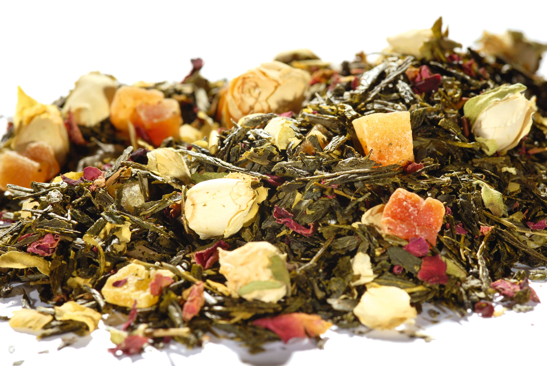 Grüner Tee (65%), Papayastücke (Papaya, Zucker), Mangostücke (Mango, Zucker, Säuerungsmittel: Zitronensäure), Rosenknospen, Aroma, Rosenblütenblätter.