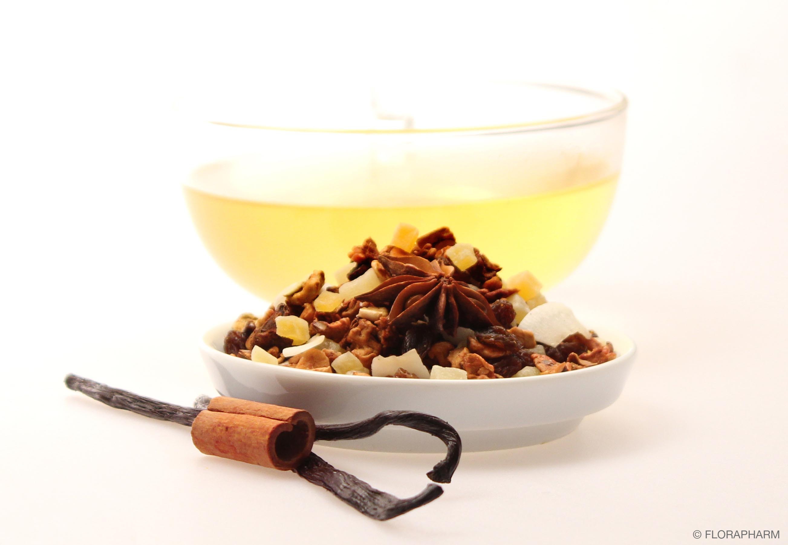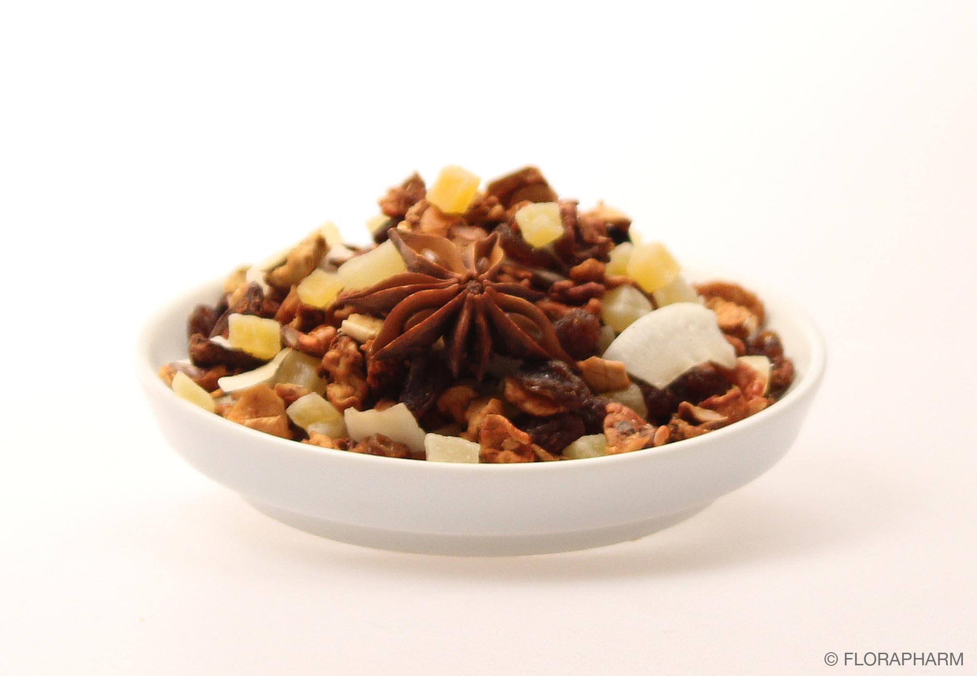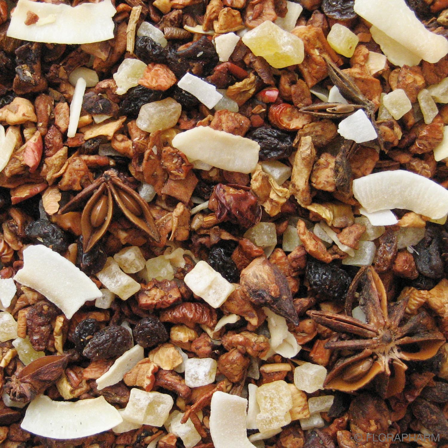Apfelstücke (Apfel, Säuerungsmittel: Zitronensäure), kandierte Mangostücke (Mango, Zucker), Weinbeeren, Zimtrinde, Kokoschips (Kokosnuss, Zucker)(5%), natürliches Aroma, Sternanis, Vanillestücke(1%)