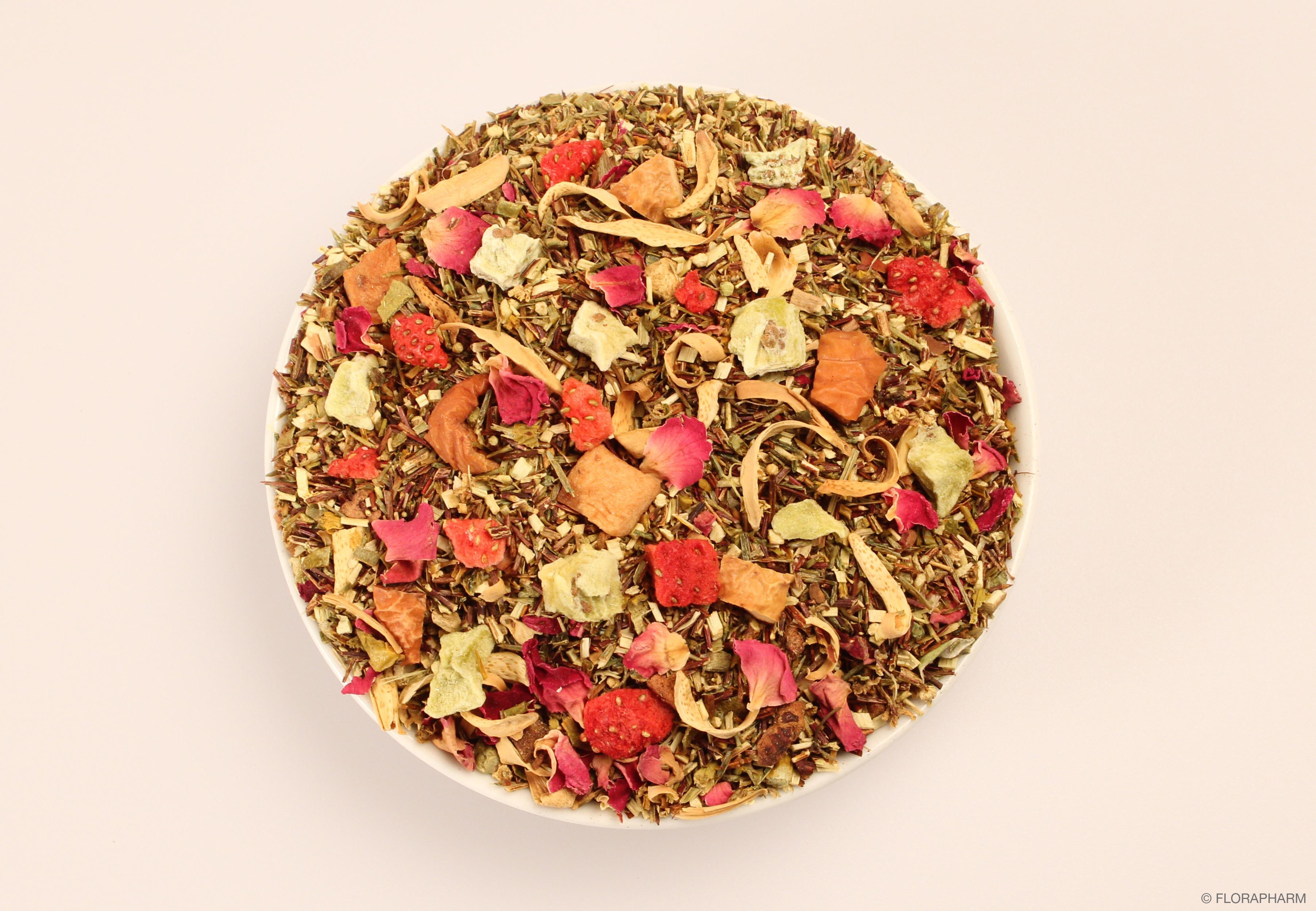 Grüner Honeybush, Apfelstücke, Aroma, Mistelkraut, Orangenblüten, Rosenblütenblätter, Holunderblüten, Erdbeerstücke(1,5%), Kiwistücke(0,5%)