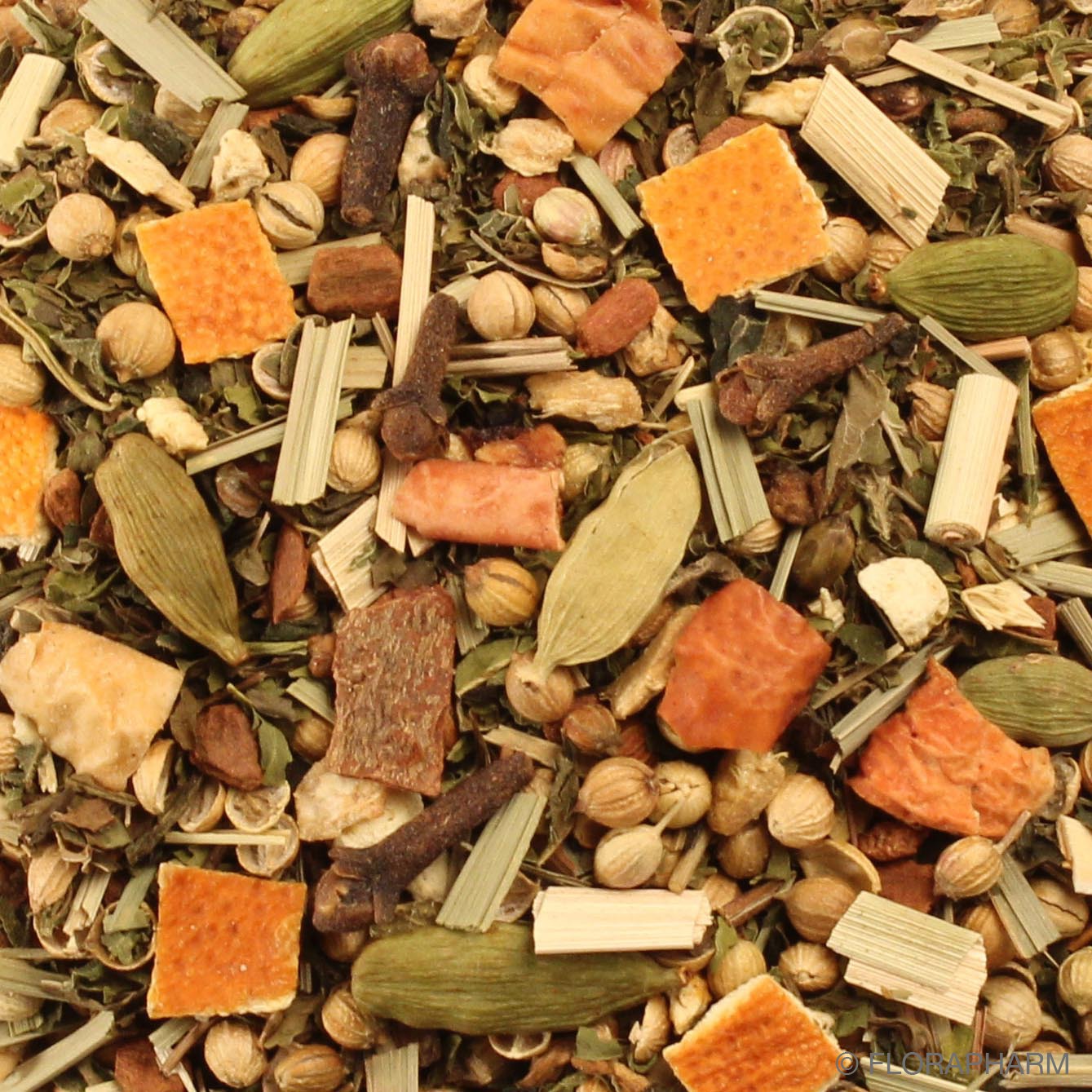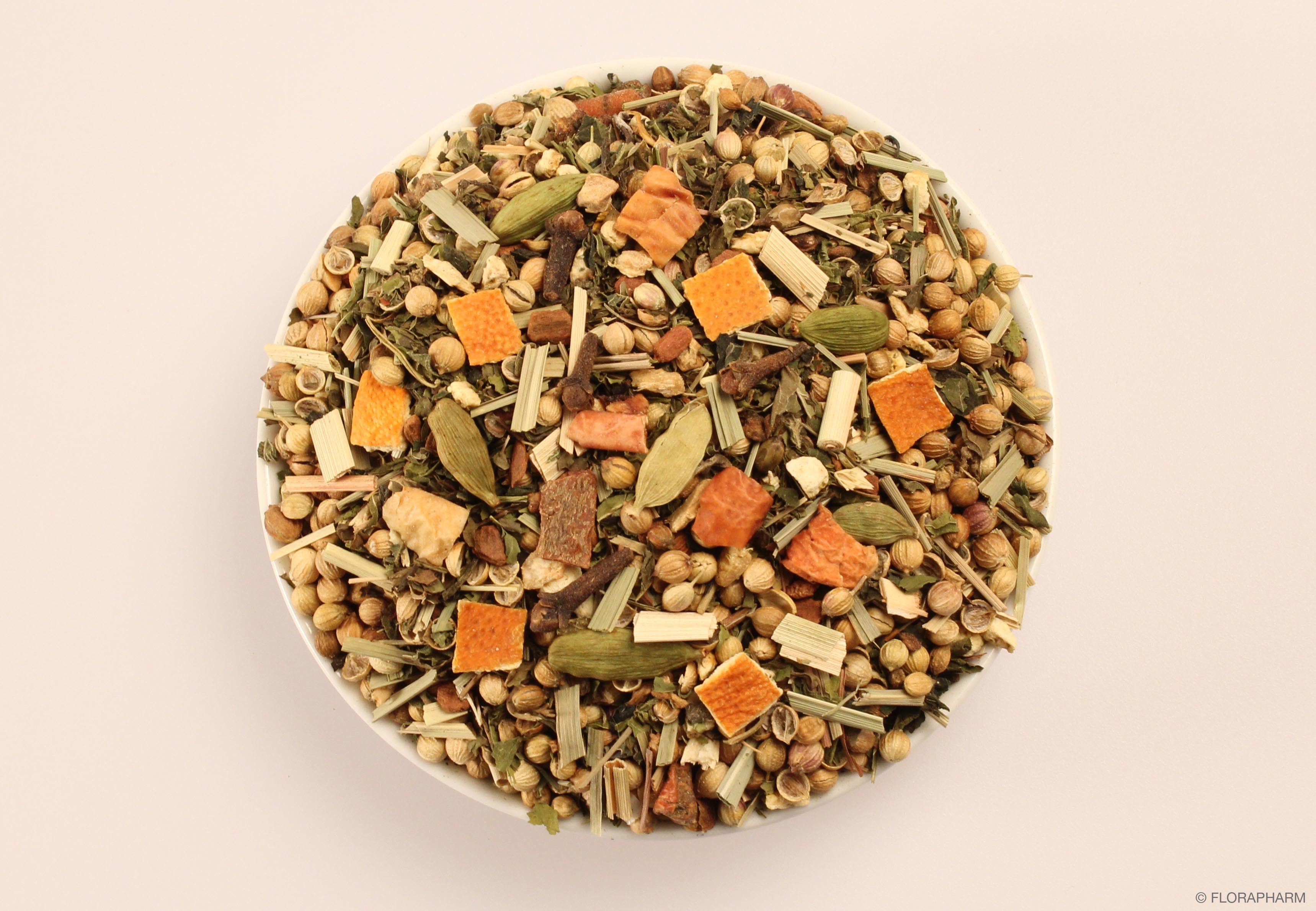 Koriander, Nanaminze(15%), Brennesselblätter, Orangenschalen, Lemongras(7%), Apfelstücke (Apfel, Säuerungsmittel: Zitronensäure), Zimtrinde, Ingwerstücke, natürliches Aroma, Nelken, Cardamom.
