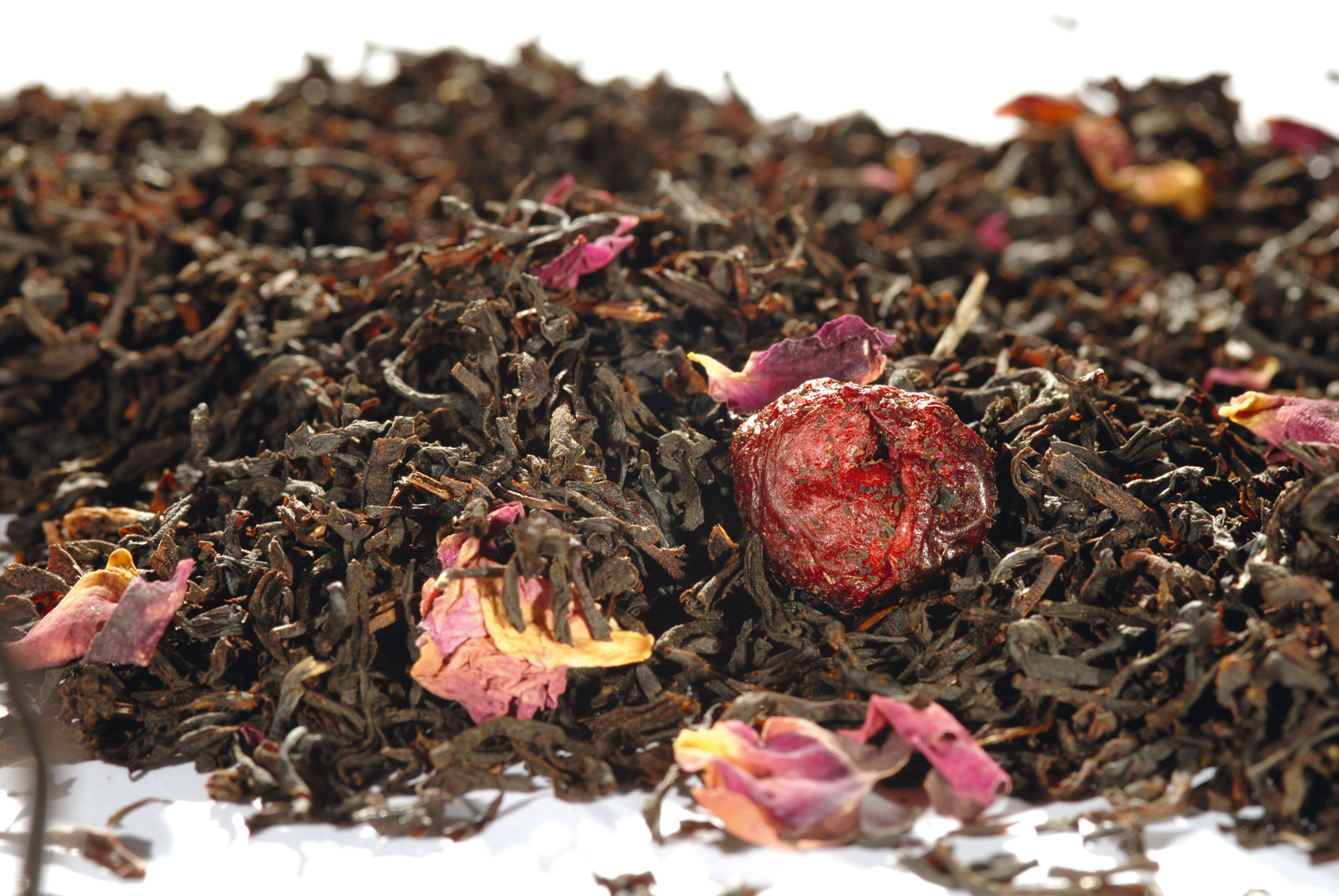 Schwarzer Tee, Aroma, Sauerkirschhälften, Rosenblütenblätter.